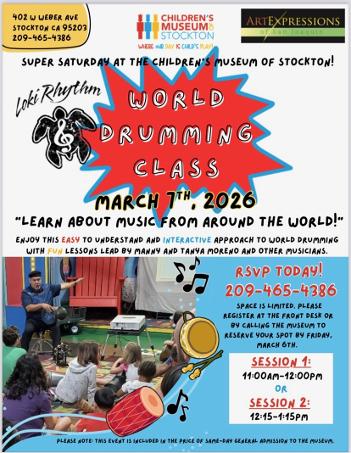 Loki Rhythm is pleased to play music and teach drum lessons at the Children's Museum of Stockton. Enjoy this easy to understand and interactive approach to world drumming and music around the world. Drums will be provided and we look forward to playing music with you once again! We will be there to bring positive vibes and spirited music. See you there!